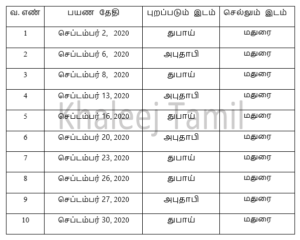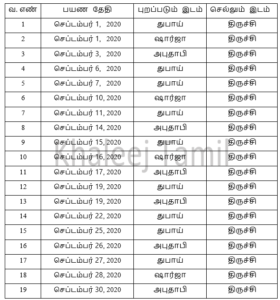 தமிழகத்திற்கு செல்லும் விமானங்களில் அதிகபட்சமாக திருச்சி சர்வதேச விமான நிலையத்திற்கு 19 விமானங்களும் மதுரைக்கு 10 விமானங்களும் சென்னைக்கு 8 விமானங்களும் ஏர் இந்தியா எக்ஸ்பிரஸ் நிறுவனம் சார்பாக இயக்கப்படும் என பட்டியலிடப்பட்டுள்ளது குறிப்பிடத்தக்கது.