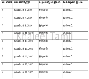 நவம்பர் மாதத்தில் இயக்கப்படவிருக்கும் விமானங்களில் 18 விமானங்கள் தமிழகத்தின் திருச்சி மற்றும் சென்னை ஆகிய நகரங்களில் இருந்து ஓமானின் தலைநகரான மஸ்கட் விமான நிலையத்திற்கு இயக்கப்படும் என அறிவிக்கப்பட்டுள்ளது. இந்த விமானங்களில் பயணம் செல்ல விரும்புபவர்கள் ஏர் இந்தியா எக்ஸ்பிரஸ் வலைதளத்திலோ அல்லது பயண முகவர்கள் மூலமாகவோ முன்பதிவு செய்து கொள்ளலாம் என்பது குறிப்பிடத்தக்கது.