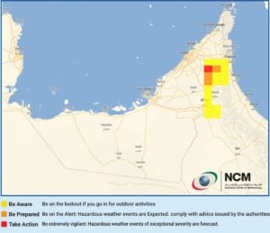 மேலும் தேசிய வானிலை ஆய்வு மையம் (NCM) அமீரகத்தின் சில பகுதிகளுக்கு சிவப்பு, ஆரஞ்சு மற்றும் மஞ்சள் எச்சரிக்கைகளை வெளியிட்டுள்ளது.