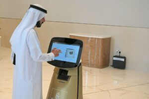 மேலும் இங்கு பயணிகள் சுய-செக்-இன் கியோஸ்க்குகளிலும், எமிரேட்ஸ் ஏஜெண்டுகளுடன் பிரத்யேக டெஸ்க்களிலும் அல்லது உலகின் முதல் செக்-இன் ரோபோ உதவியாளரான சாராவின் உதவியுடன் செக்-இன் செய்யலாம். குறிப்பாக, இந்த ஆண்டின் தொடக்கத்தில் எமிரேட்ஸ் தலைமையகத்தில் அறிமுகம் செய்யப்பட்ட, காண்போரின் கண்ணைக் கவரும் வகையில் 2.5 மீட்டர் LCD திரையுடன் உருவாக்கப்பட்டுள்ள ரோபோ சாராவுடன் பயணிகள் தொடர்பு கொள்வது இதுவே முதல் முறையாகும்.