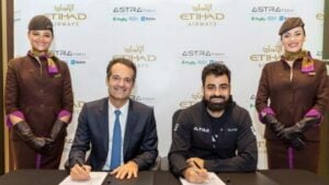 அரேபியன் டிராவல் மார்க்கெட்டில் எதிஹாட் ஏர்வேஸ் CEO அன்டோனால்டோ நெவ்ஸ் மற்றும் அஸ்ட்ரா டெக்கின் நிறுவனர் அப்துல்லா அபு ஷேக் ஆகியோருக்கு இடையே விமான டிக்கெட்டுகளை முன்பதிவு செய்து கொள்வதற்கான இந்த கூட்டு ஒப்பந்தம், எதிஹாட் மற்றும் அஸ்ட்ரா டெக் நிறுவனத்தின் உயரதிகாரிகள்முன்னிலையில் கையெழுத்தானதாக செய்திகள் வெளியாகியுள்ளன.