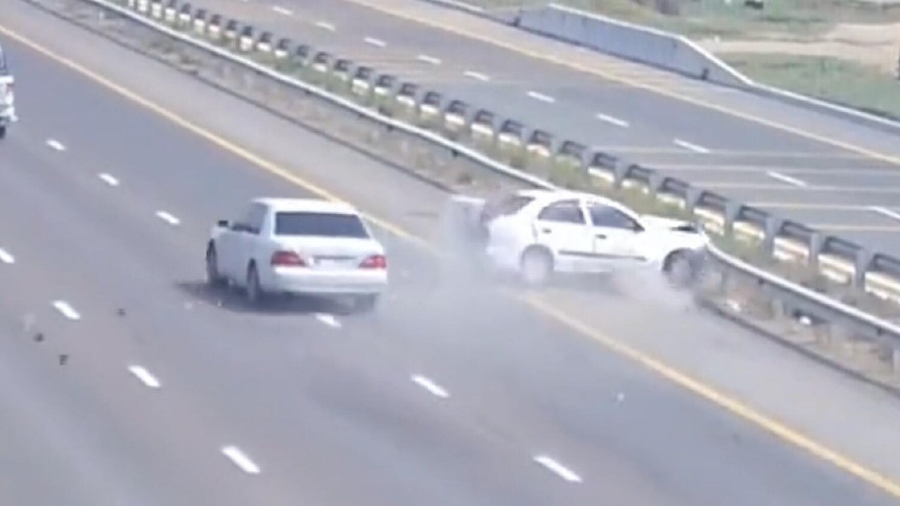 விபத்தின் தாக்கம் மிகவும் மோசமாக இருந்ததால், முன்னால் சென்ற கார் சாலைத் தடுப்பில் மோதி, கட்டுப்பாட்டை இழந்து சுழன்றதையும், அப்போது அங்கு புழுதி ஏற்பட்டதையும் வீடியோவில் பார்க்கலாம்.