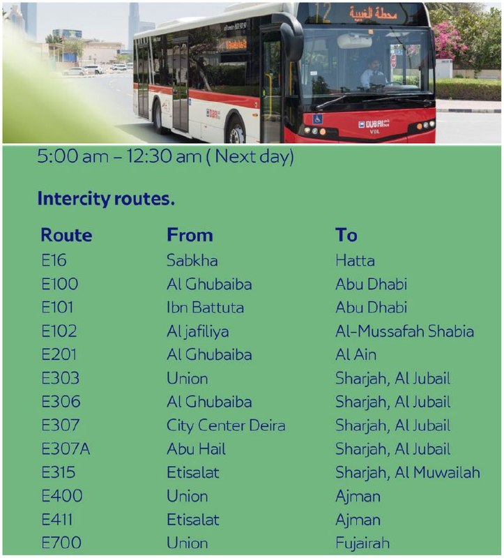 துபாயில் உள்ள பொதுப் பேருந்துகள் ஜூலை 21 அன்று காலை 05:00 மணி முதல் நள்ளிரவு 12:30 மணி வரை இயங்கும். அதேபோன்று அனைத்து மெட்ரோ இணைப்பு பேருந்து சேவைகளும் மெட்ரோ கால அட்டவணைகளுடன் ஒத்துப்போகும் வகையில் இயக்கப்படும்.