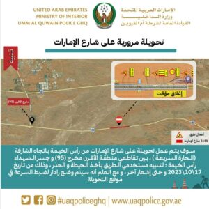 மேலும், அந்த பதிவில், ராஸ் அல் கைமாவிலிருந்து ஷார்ஜாவை நோக்கிய எமிரேட்ஸ் சாலையில், அல் அகார்ன் ஏரியா, எக்ஸிட் 95 மற்றும் அல் ஷுஹாதா பிரிட்ஜ், ராஸ் அல் கைமா ஆகியவற்றின் இன்டெர்செக்ஷன்களுக்கு இடையில் ஒரு மாற்றுப்பாதை இருக்கும் என்று காவல்துறை அறிவித்துள்ளது.