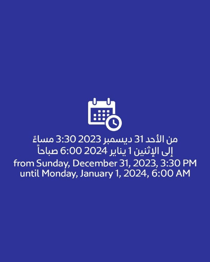- துபாய் மெட்ரோ: டிசம்பர் 31 ஆம் தேதி காலை 8 மணி முதல் ஜனவரி 1 ஆம் தேதி இறுதி வரை