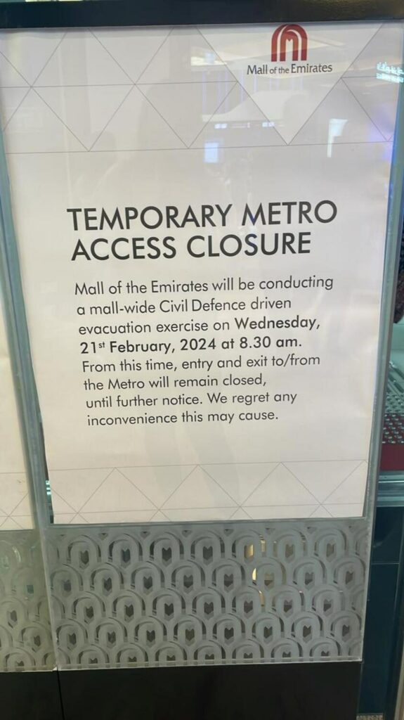 அன்றைய தினம் மால் முழுவதும் சிவில் பாதுகாப்புப் (Civil Defence) பிரிவினரால் வெளியேற்றும் பயிற்சி (evacuation exercise) நடத்தப்படுவதால், அணுகல் தடை செய்யப்பட்டுள்ளது. மால் நுழைவாயிலில் இருந்து மெட்ரோ என்ட்ரி மற்றும் எக்ஸிட் ஆகிய இரண்டு அணுகலும் மறு அறிவிப்பு வரும் வரை குறிப்பிடப்பட்ட நேரத்தில் இருந்து கிடைக்காது என்றும் தெரிவிக்கப்பட்டுள்ளது.
