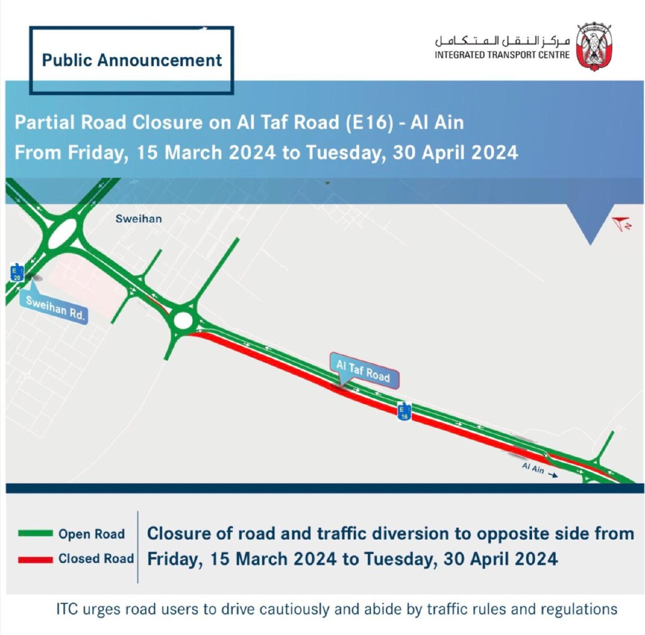 இது தொடர்பாக ஒருங்கிணைந்த போக்குவரத்து மையம் வெளியிட்டுள்ள அறிவிப்பில், மார்ச் 15 முதல் ஏப்ரல் 30 வரை அபுதாபி எமிரேட்டிற்கு உட்பட்ட அல் தாஃப்-அல் அய்ன் (E16) சாலையில் பகுதியளவு சாலை மூடப்படும் என்று குறிப்பிட்டுள்ளது.