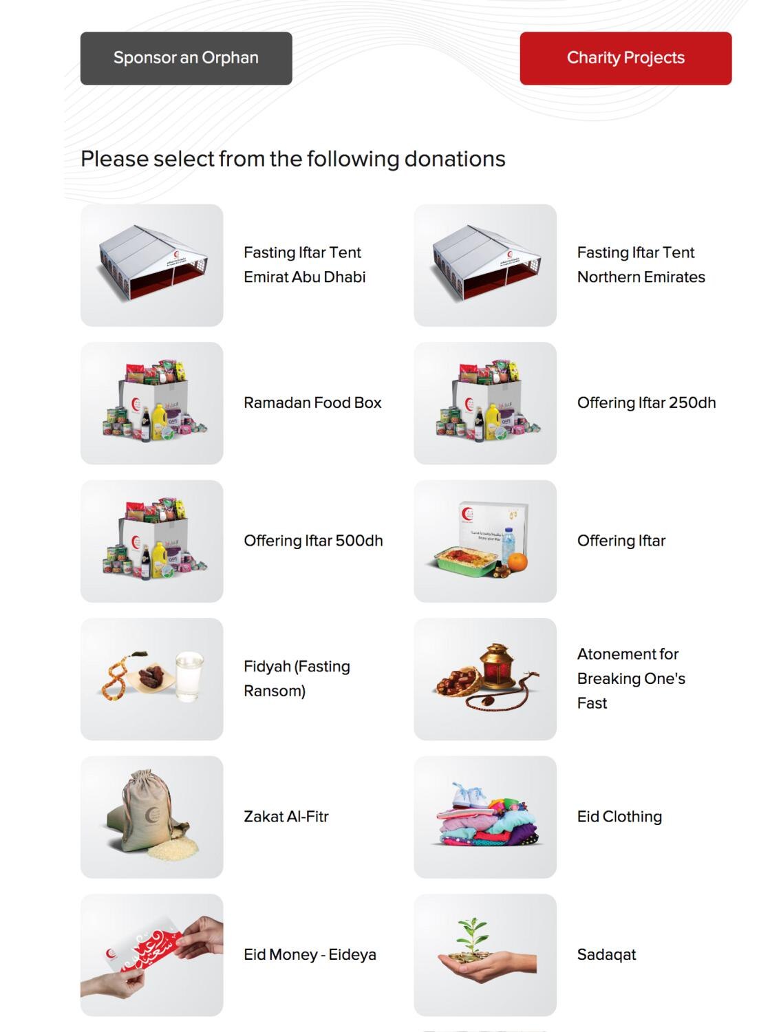 சர்வதேச செஞ்சிலுவைச் சங்கம் (International Federation of Red Cross) மற்றும் செஞ்சிலுவைச் சங்கங்களின் இணை நிறுவனமான UAE Red Crescent Society, குடியிருப்பாளர்கள் நன்கொடை அளிப்பதற்காக பல ரமலான் நன்கொடை திட்டங்களை வழங்குகிறது. எனவே இப்தார் உணவிற்கு நனகொடை வழங்க விரும்புபவர்கள் இதன் மூலமும் தங்கள் பங்களிப்பை வழங்க முடியும்.