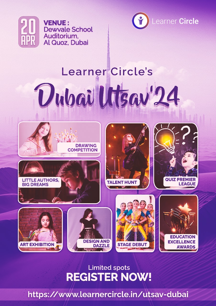 உங்கள் குழந்தைகளிடம் ஒளிந்திருக்கும் திறனை கண்டறிந்து, கண்டறிந்த திறனை, திறமை வாய்ந்த ஆசிரியர்களை கொண்டு மேம்படுத்துவதுடன், மற்றவர்களுக்கு வெளிப்படுத்தும் விதமாக, தற்போது துபாயில் வரும் ஏப்ரல் 20, Learner Circle’s Dubai Utsav ‘24 கலை விழா பல முக்கிய நபர்களின் முன்னிலையில் போட்டியினை நடத்த தயாராகியுள்ளது.