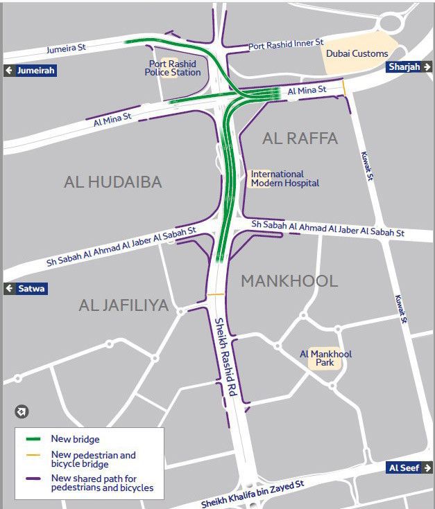 * அல் கலீஜ் பாலம்: அல் கலீஜ் தெருவில் பர் துபாய் நோக்கி மூன்று பாதைகள் கொண்ட ஒரு முக்கிய பாலமும் கட்டி முடிக்கப்பட்டுள்ளது.