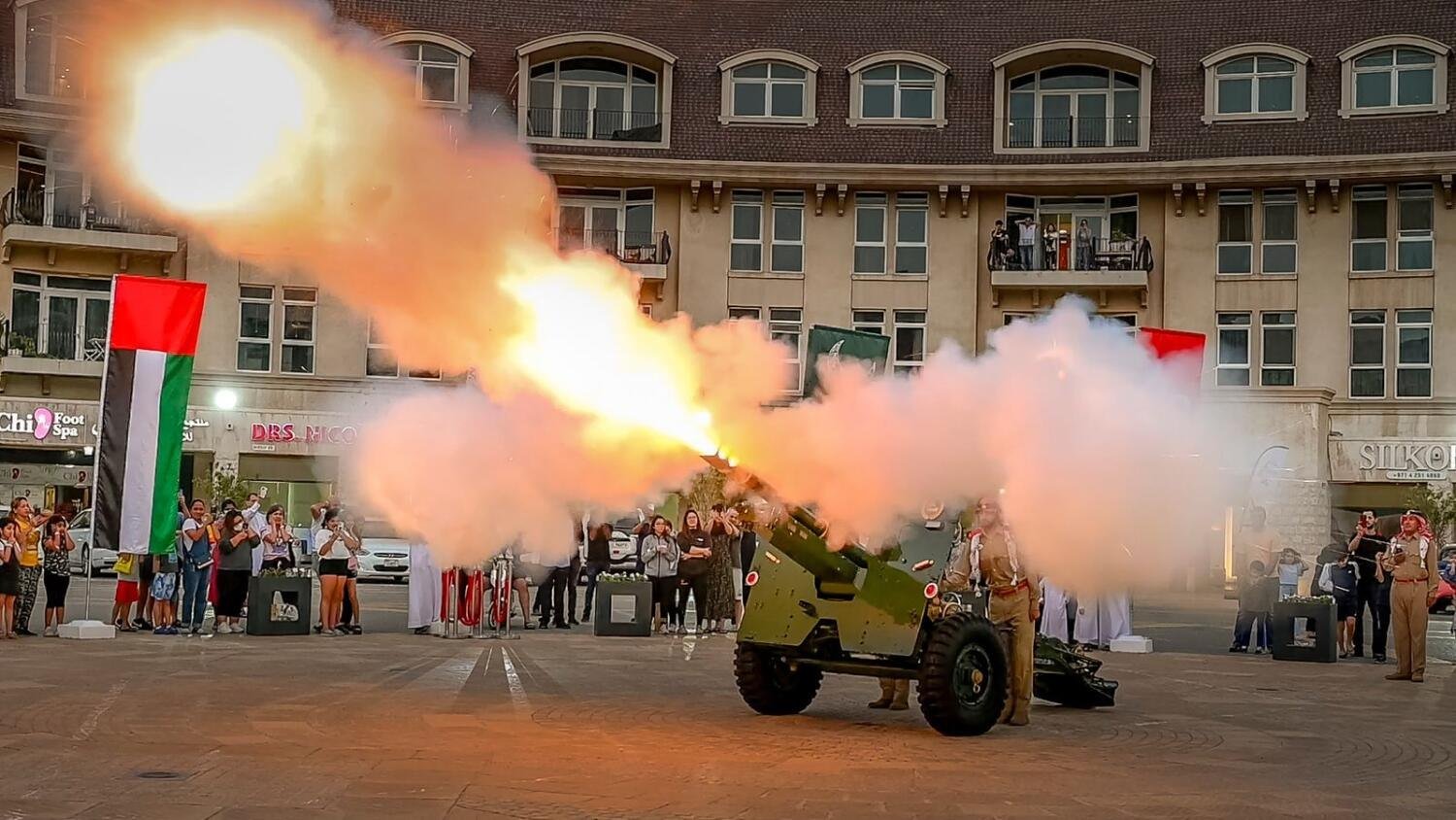 துபாயில் தேர்ந்தெடுக்கப்பட்ட இடங்களில் கனான் ஃபயரிங் எனும் பீரங்கிகளை சுடுவதன் மூலம் ஈத் அல் அதாவை அறிவிக்க அனைத்து ஏற்பாடுகளும் செய்யப்பட்டுள்ளன என்று இதன் குழுவின் தளபதி லெப்டினன்ட் கர்னல் அப்துல்லா தாரிஷ் அல் அமிமி தெரிவித்துள்ளார். ஈத் தொழுகைக்குப் பிறகு அதிகாலை 5.45 மணியளவில் கனான் ஃபயரிங்கைக் காணக்கூடிய இடங்களின் பட்டியல் கீழே கொடுக்கப்பட்டுள்ளது:
