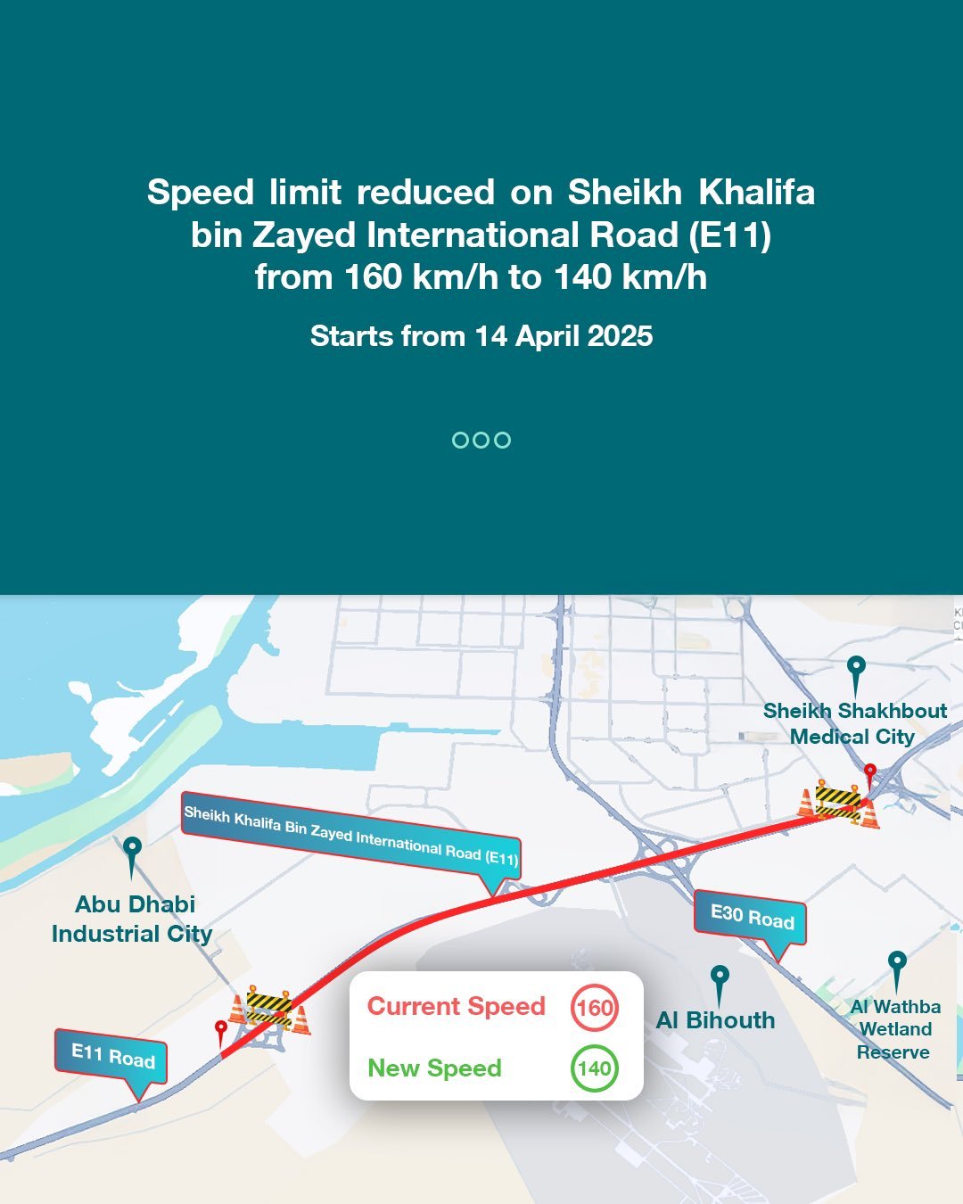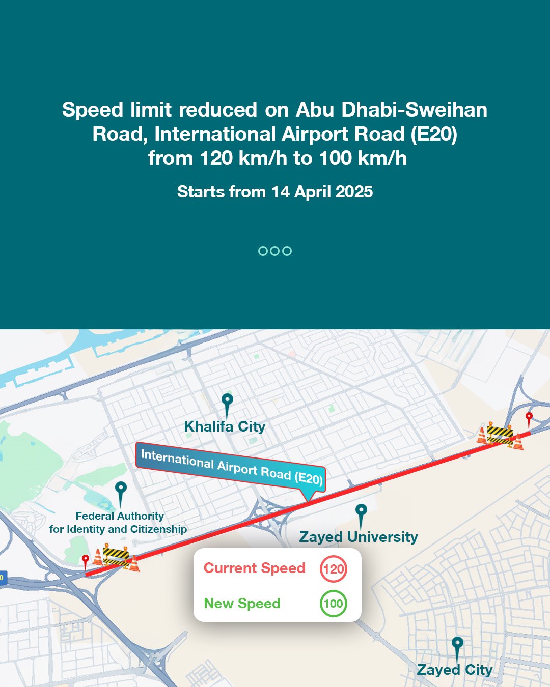 அதே போல் அபுதாபி-ஸ்வைஹான் (sweihan) சாலையில் (E20) வேக வரம்பு ஏப்ரல் 14, 2025 முதல் மணிக்கு 120 கிமீட்டரில் இருந்து 100 கிரோ மீட்டராக குறைக்கப்படும் என கூறப்பட்டுள்ளது. இந்ர திருத்தப்பட்ட வேக வரம்பு, எமிரேட்டில் சாலை பாதுகாப்பை மேம்படுத்துவதற்கும் போக்குவரத்து விபத்துகளைக் குறைப்பதற்கும் மேற்கொள்ளப்படும் முயற்சிகளின் ஒரு பகுதியாகும் என கூறப்பட்டுள்ளது.