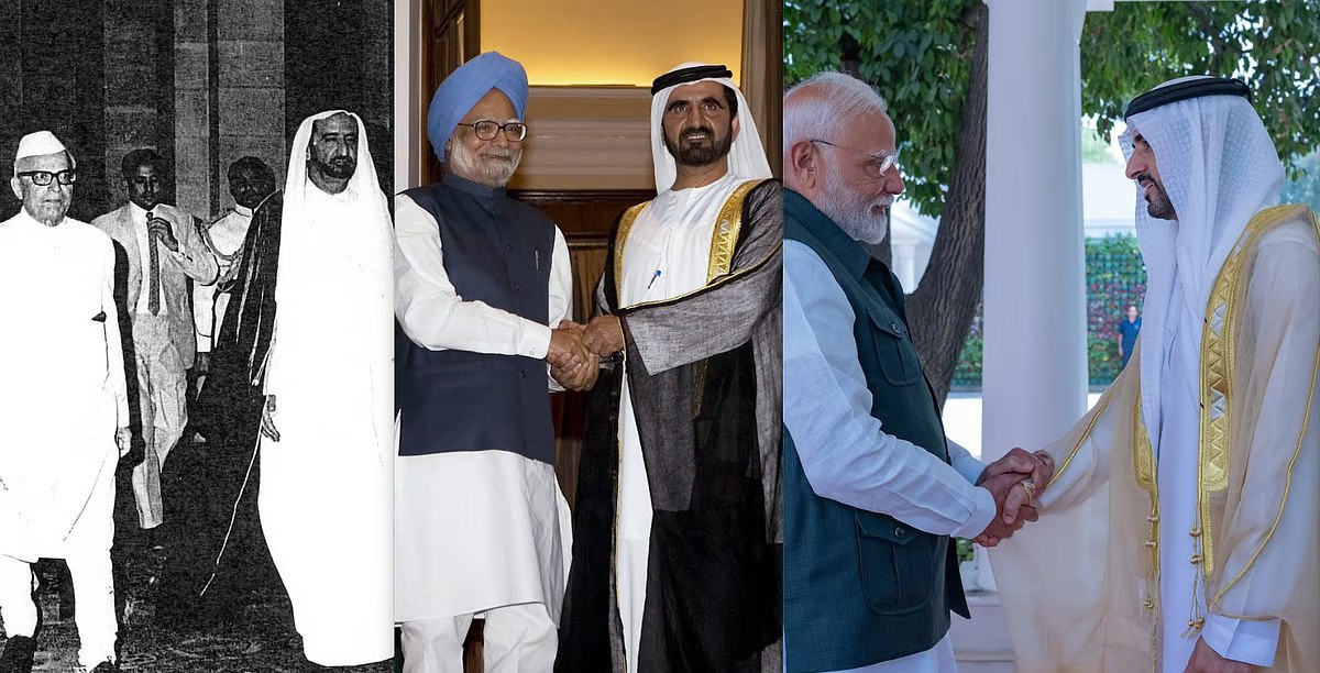 1974ஆம் ஆண்டு முதல், துபாயை ஆளும் மக்தூம் குடும்பத்தின் மூன்று தலைமுறைகள் தொடர்ச்சியான வருகைகள் மூலம் இந்தியாவுடன் வலுவான தொடர்புகளை வளர்த்து, இரு நாடுகளுக்கும் இடையிலான உறவை ஆழப்படுத்தியுள்ளன. மறைந்த ஷேக் ரஷீத் பின் சயீத் அல் மக்தூம் முதல் தற்போதைய துபாய் இளவரசர் ஷேக் ஹம்தான் பின் முகமது அல் மக்தூம் வரை, துபாயின் தலைவர்கள் இருதரப்பு உறவுகளை மேம்படுத்த தொடர்ந்து பணியாற்றி இரு நாடுகளின் ஒத்துழைப்பிற்கும் குறிப்பிடத்தக்க பங்களிப்பை வழங்கியுள்ளனர். மூன்று தலைமுறையாக இந்தியாவிற்கு வருகை தரும் துபாய் அரச குடும்பத்தினர் பற்றியும், அவர்களின் வருகை பற்றியும் சிறிய கண்ணோட்டத்தை இங்கே பார்க்கலாம்: