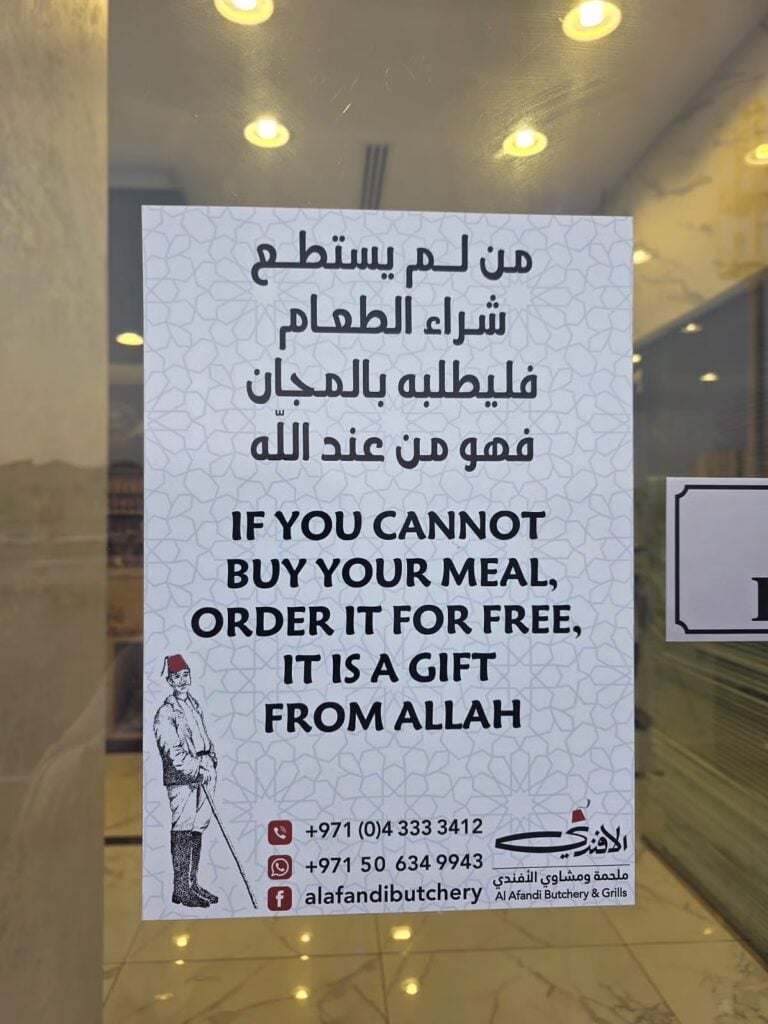 கடந்த நான்கு ஆண்டுகளாக, ஜோர்டானிய வெளிநாட்டவருக்குச் சொந்தமான ‘Al Afandi Butchery and Grills’ என்ற சிறிய உணவகம் தேவைப்படும் எவருக்கும் இலவச உணவை வழங்கி வருகிறது. யாரும் பசியுடன் இருக்கக்கூடாது என்ற எளிய ஆனால் சக்திவாய்ந்த நம்பிக்கையுடன் செயல்பட்டு வரும் இந்த கடையில் நாடு, பின்னணி அல்லது சூழ்நிலையைப் பொருட்படுத்தாமல், பணம் செலுத்த முடியாத எவரும் கடைக்குள் சென்று தங்களுக்குத் தேவையானதை ஆர்டர் செய்து சாப்பிடலாம் என்று கூறப்படுகிறது.