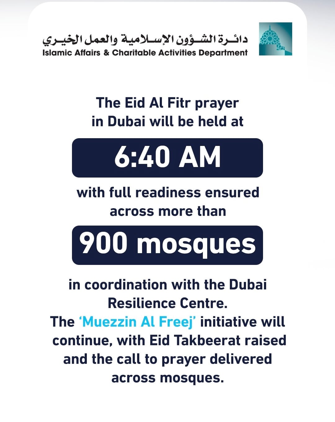 அவ்வாறு, துபாயில் உள்ள அனைத்து மசூதிகளிலும் நாளை காலை 6:40 மணிக்கு ஈத் அல் ஃபித்ர் சிறப்பு தொழுகை நடைபெறும் என்று துபாயின் இஸ்லாமிய விவகாரங்கள் மையம் அறிவித்துள்ளது. மேலும் இதற்காக 900-க்கும் மேற்பட்ட மசூதிகள் முழுமையான தயார்நிலையில் இருப்பதும் உறுதி செய்யப்பட்டுள்ளது.