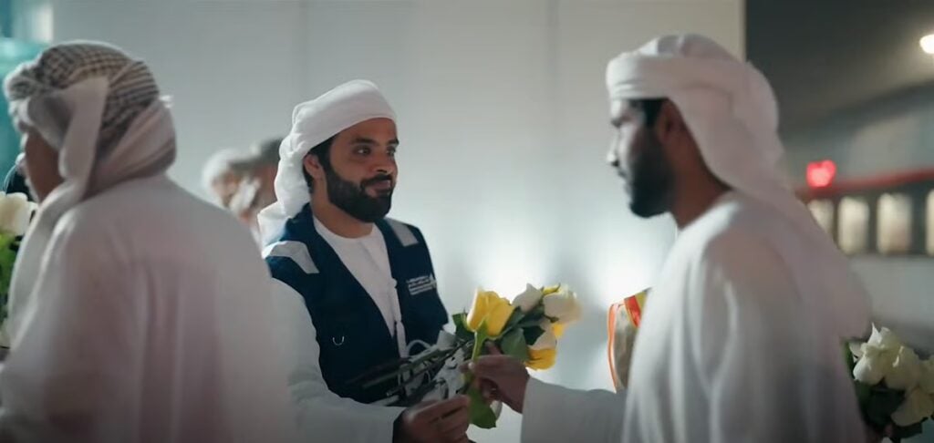 அபுதாபி அரசு ஊடக அலுவலகம் இது குறித்து வெளியிட்ட பதிவில், பயணிகள் தங்கள் இலக்கை அடையும்போது மலர்களால் வரவேற்கப்படுவதைக் காணலாம்.