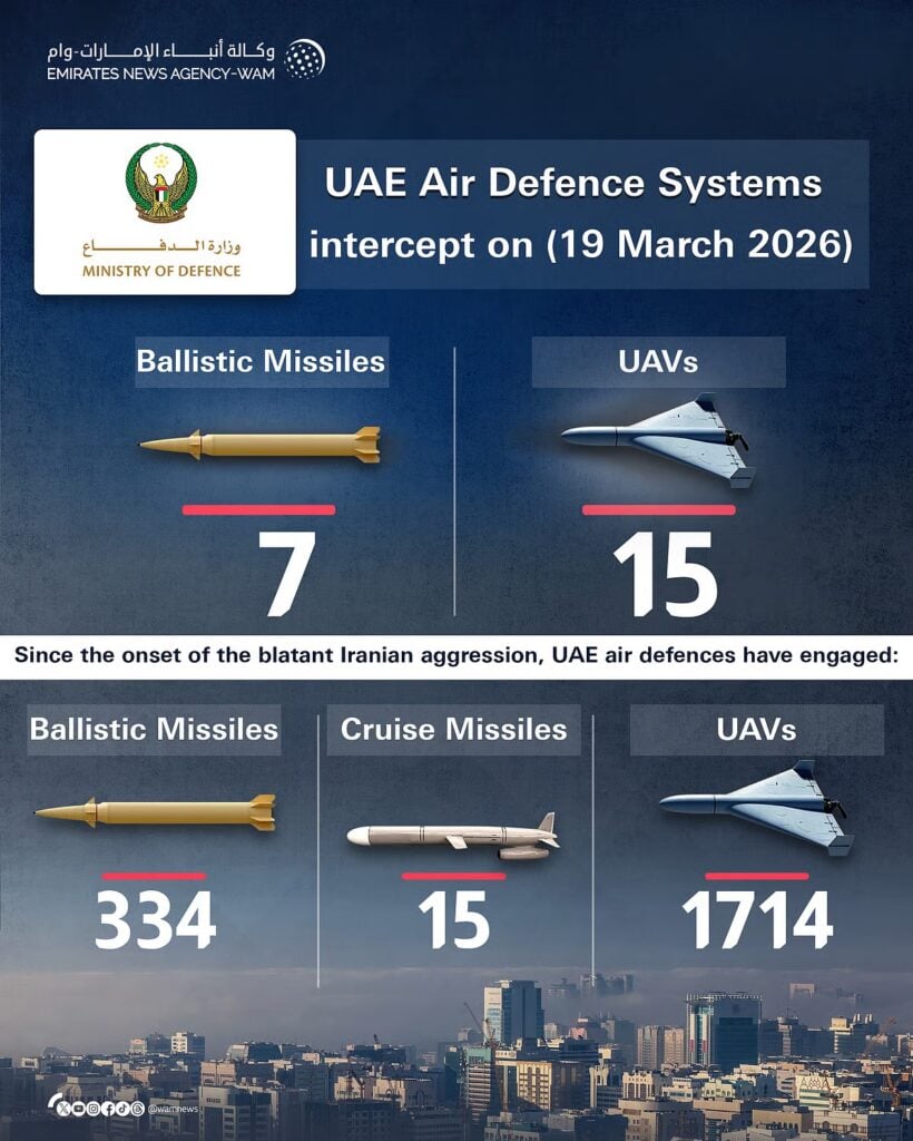 அண்டை நாடுகள் மீது ஈரானின் அப்பட்டமான தாக்குதல்கள் தொடங்கியதிலிருந்து, ஐக்கிய அரபு அமீரகத்தின் வான் பாதுகாப்புப் படைகள் இதுவரையிலும் 334 பாலிஸ்டிக் ஏவுகணைகளையும், 15 குரூஸ் ஏவுகணைகளையும் மற்றும் 1,714 ஆளில்லா விமானங்களையும் வெற்றிகரமாக இடைமறித்துள்ளன.